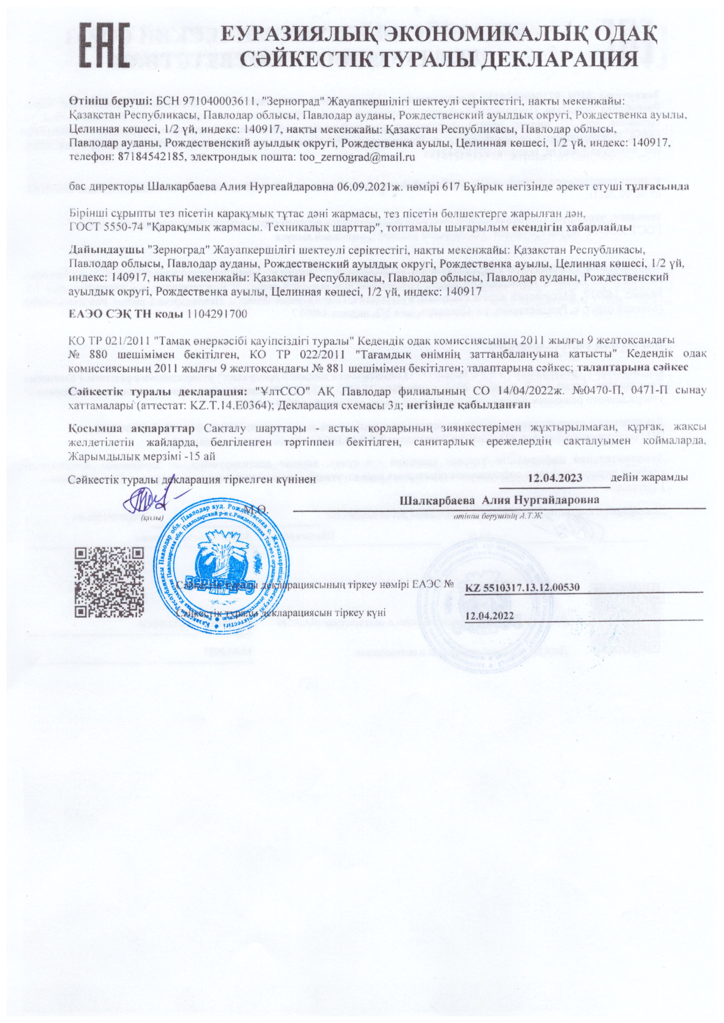 Продукция завода и в дальнейшем будет иметь высокие потребительские свойства в сравнении с товарами конкурентов, так как проводится плановая модернизация производства, постоянная сертификация лаборатории, закупка новых приборов, которые помогают следить за качеством продукции. На сегодняшний день продукция компании в виде гречневой крупы представлена во всех регионах Казахстана следующими торговыми марками – «Апашка», «Алтын Ханым», «Кудесница», «Царская Павлодарская», «Зерноград», «Гречанка».